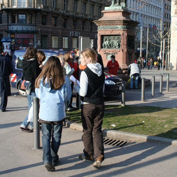 Jedes Kind erhält ein handliches DIN A5-Heft mit Stadtplan und Fragen. Die Gruppe bleibt zusammen und wird begleitet.